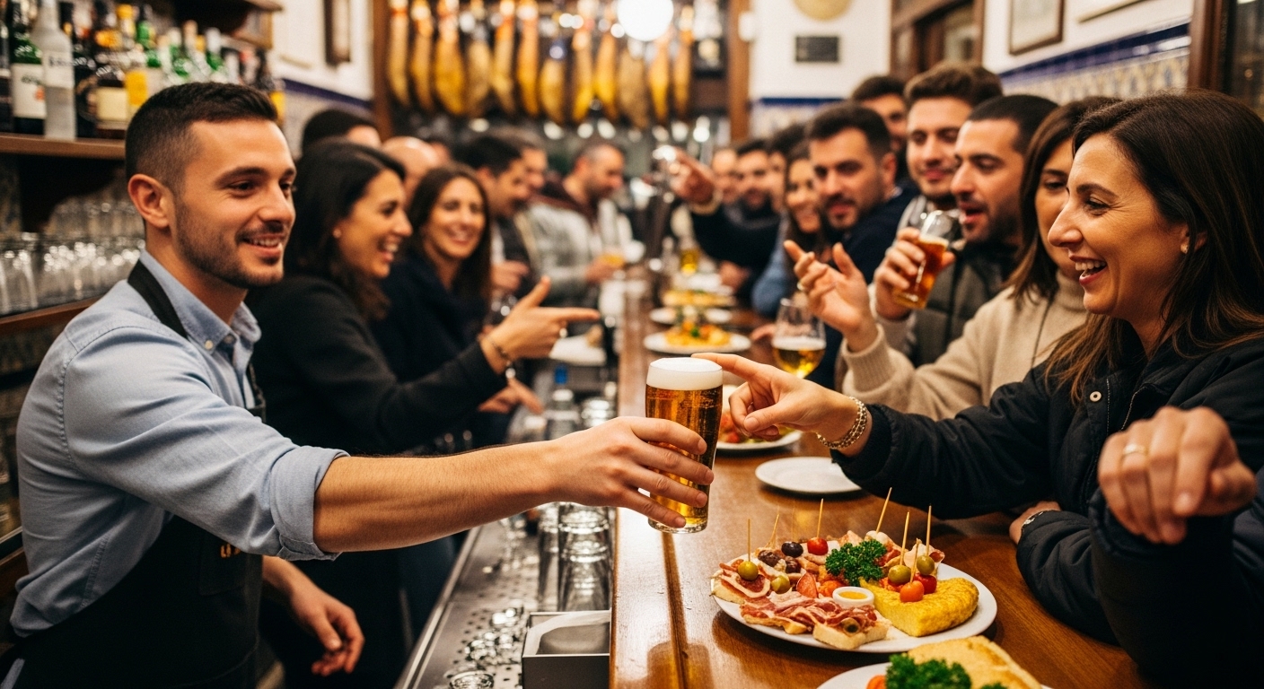 그라나다는 스페인 내에서도 **음료 한 잔만 시키면 맛있는 타파스가 공짜**로 나오는 문화가 잘 남아있는 것으로 유명합니다. 맥주나 와인 한 잔(2~4유로)에 훌륭한 요리가 함께 나오니, 여러 가게를 옮겨 다니며 즐기는 '타파스 투어(Tapas Tour)'의 최적지입니다.