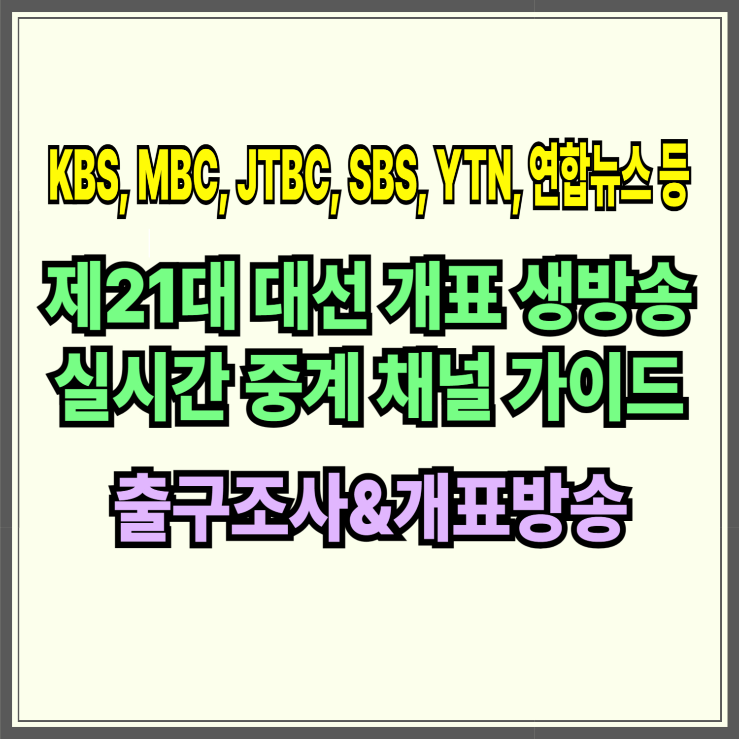 [제21대 대선 생방송 LIVE] KBS·MBC·SBS·JTBC·YTN·연합뉴스, 출구조사부터 개표까지! 채널 선택 가이드 📺🔴 다가올 제21대 대통령 선거, 그 뜨거운 순간을 함께할 방송 채널은 어디? 지상파부터 종편, 보도전문채널까지! 각 방송사별 출구조사 및 개표방송 생방송 라이브 특징을 미리 살펴보고 그날의 감동과 정보를 놓치지 마세요!